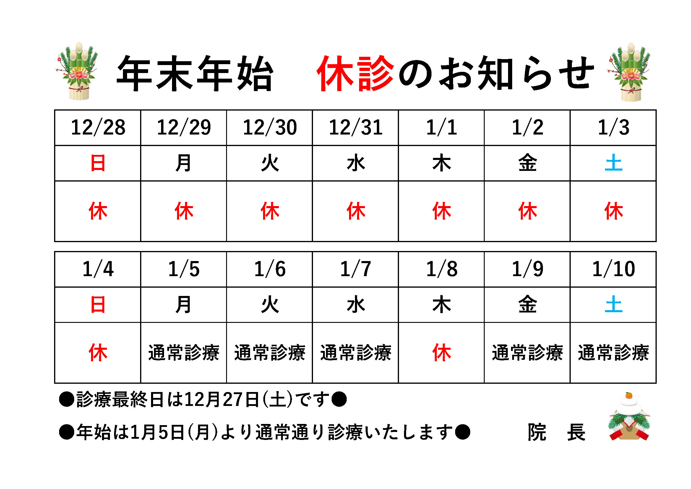 内科外来年末年始のお知らせ