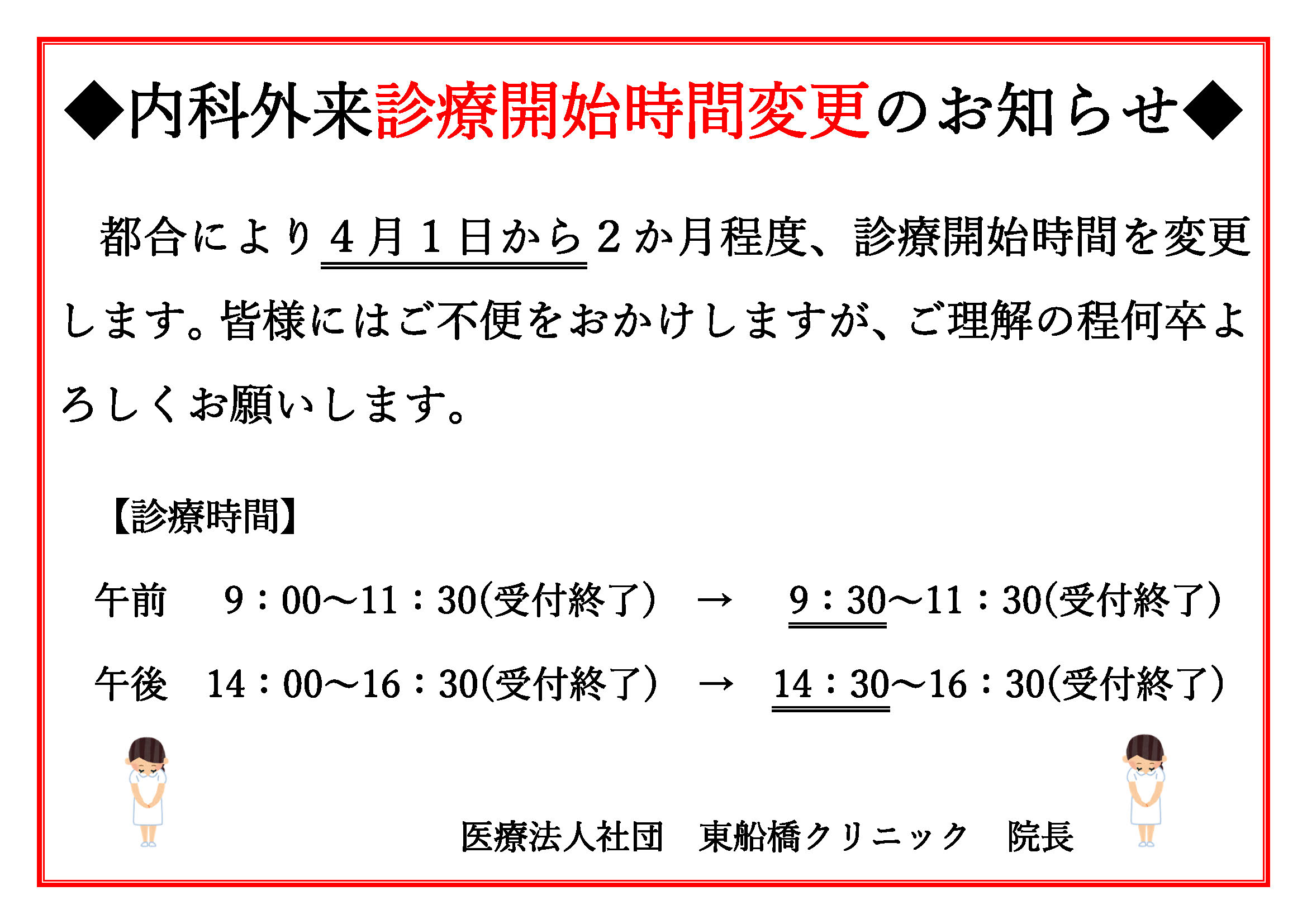 内科外来診療開始時間変更のお知らせ